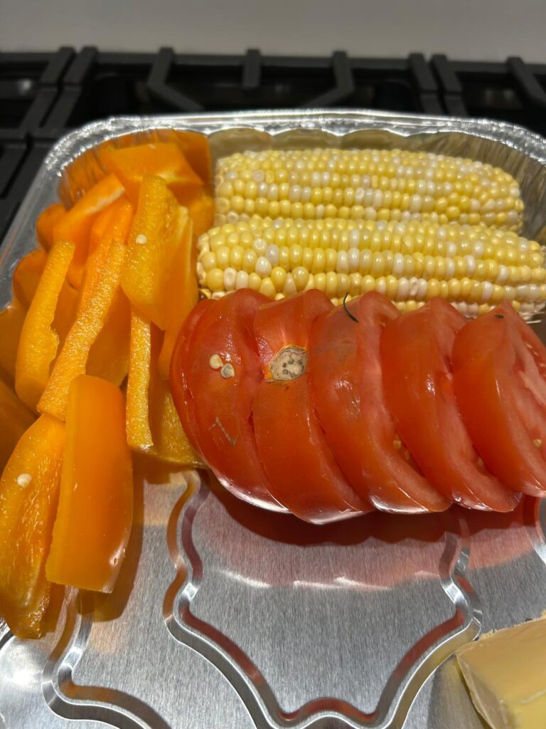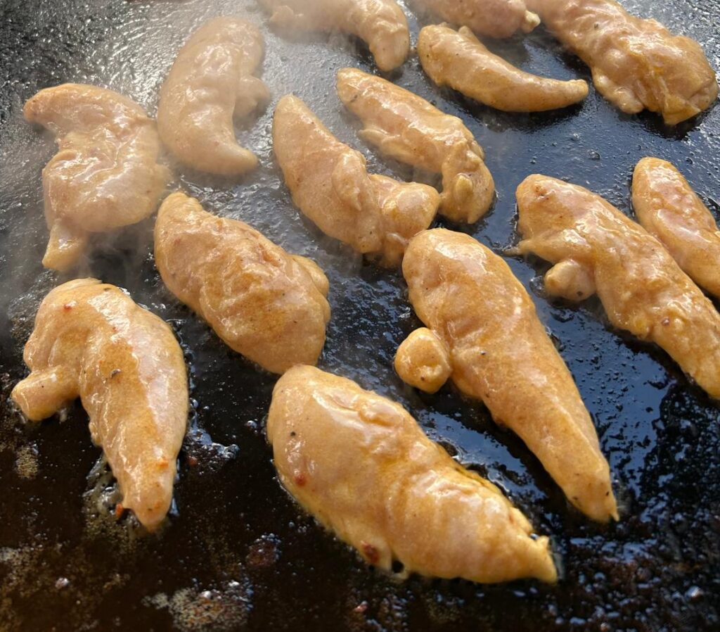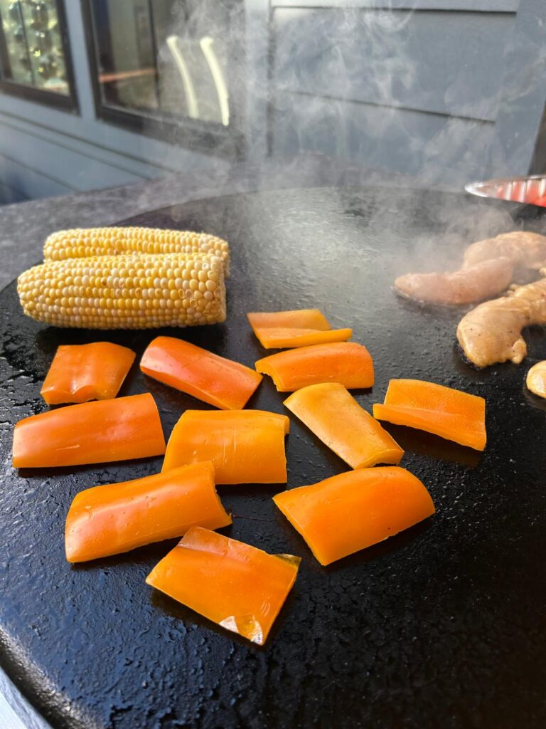 • Place the corn on the cob onto the grill first as they will take the longest to cook. Once the first side is charred, twist them to start charring another side and then add the chicken tenders to the grill pan.