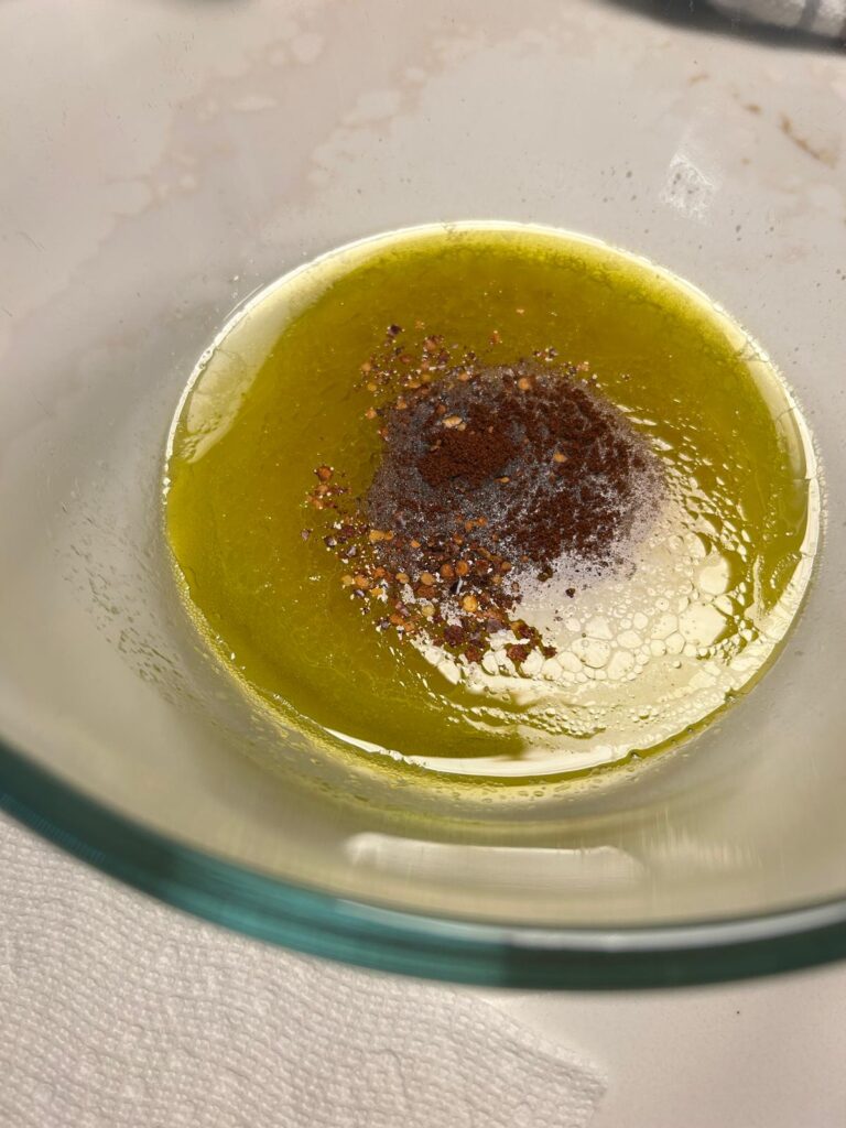 • In a medium size bowl mix together the olive oil, lemon juice, mustard, paprika and red pepper flakes and season also with a little salt and pepper.