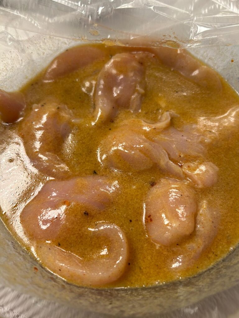 • Place the chicken tenders into the bowl and toss to coat. Cover and leave to marinate whilst you prepare the rest of the ingredients.