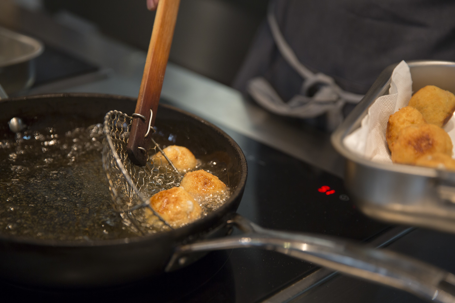 - Heat enough sunflower oil in a pan until hot to cover the croquetes, then place into the oil.