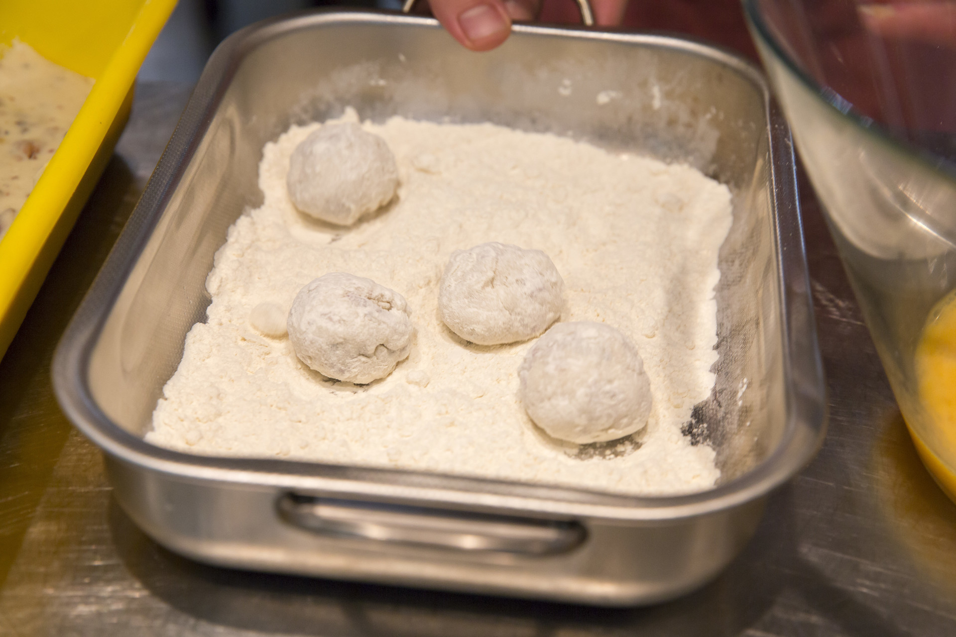 - Place some plain flour in a bowl. In a separate bowl, place some beaten eggs. Take small handfuls of the chilled mixture and roll into balls. First, dip into the egg mixture and cover fully, then roll into the flour and finally roll in and coat completely with the breadcrumbs.