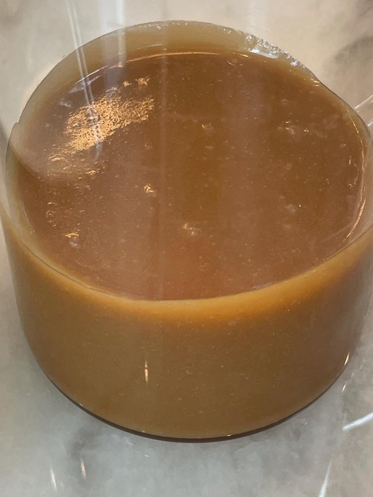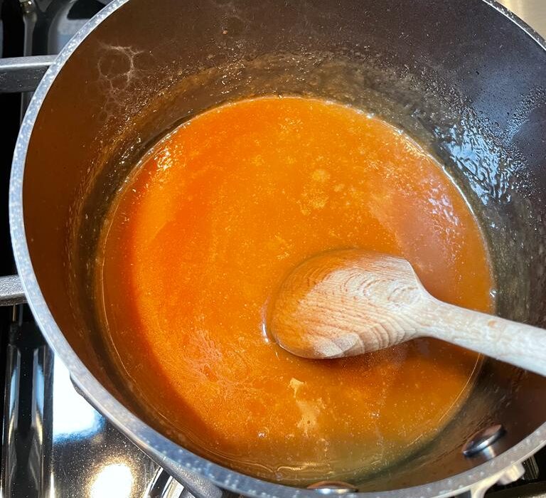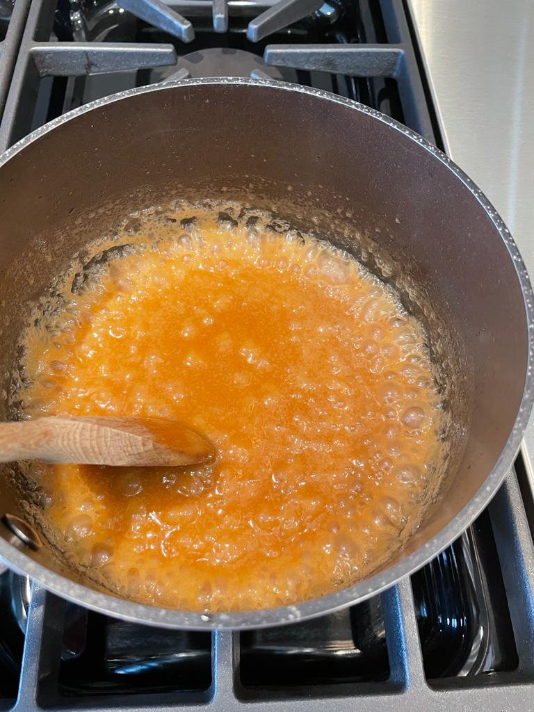• Allow to simmer until it turns a golden caramel colour then add the butter and stir quickly – do not be alarmed as it will bubble vigorously.