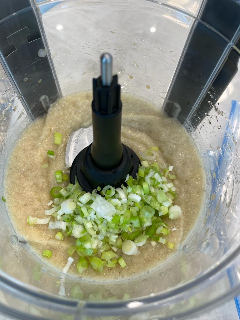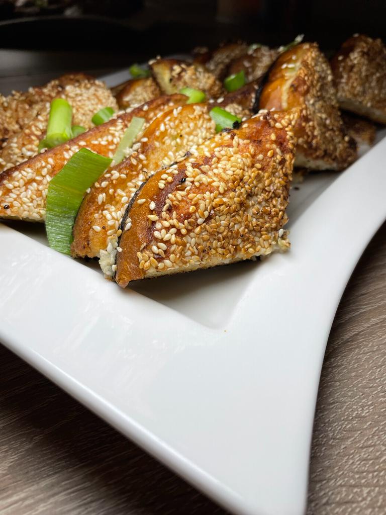 - Slice into triangles and serve with a few more sliced scallions and a side of soy sauce.