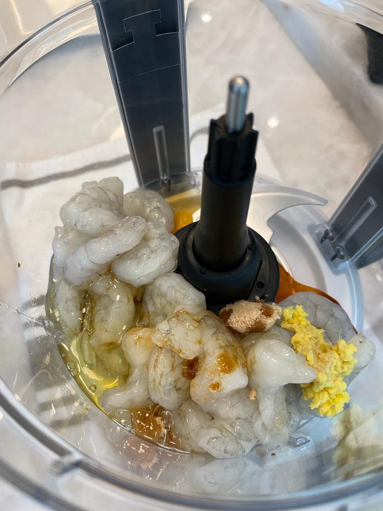 - Place the prawns, egg whites, sugar, soy sauce and ginger into a food processor and pulse until smooth.