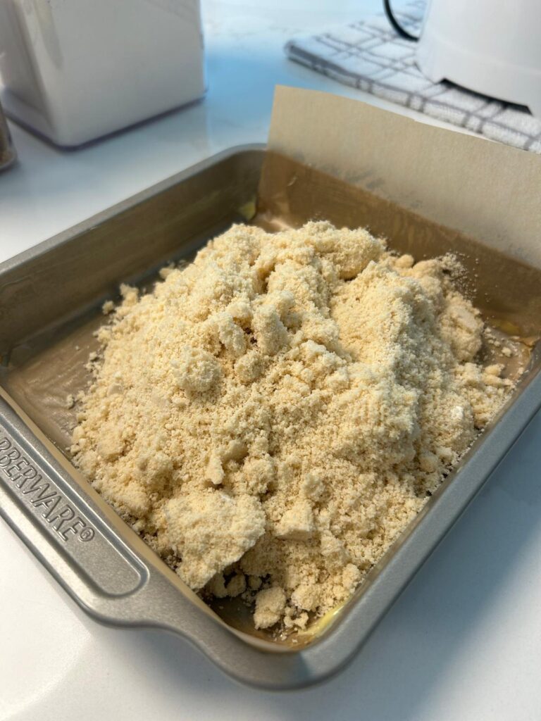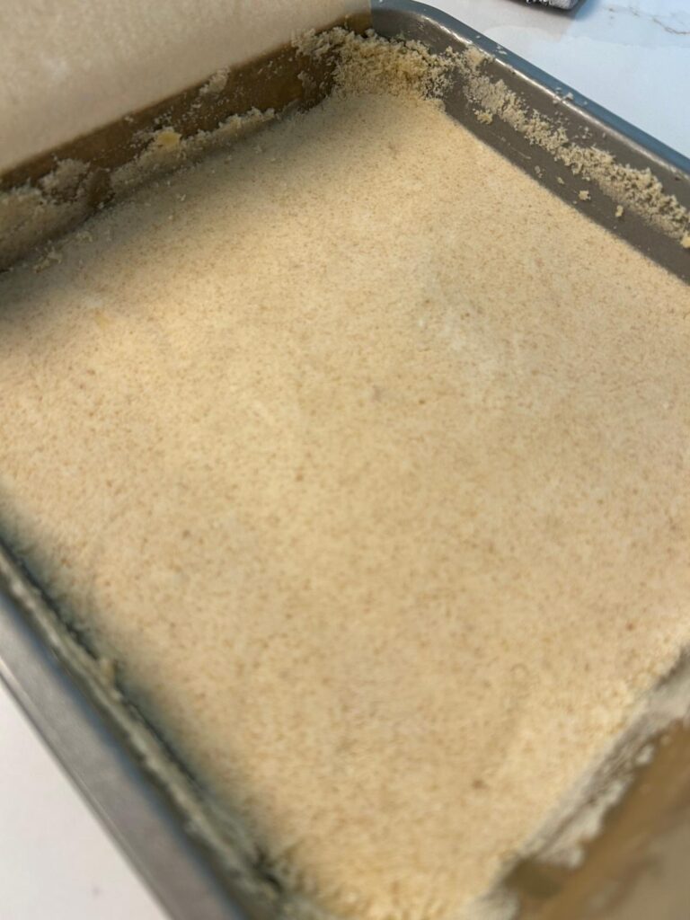 - Place the butter and flour and sugar for the cookie base into a food processor and pulse until you see the mixture resemble fine crumbs. Continue pulsing until the dough starts to stick together then tip into the base of the baking tin.