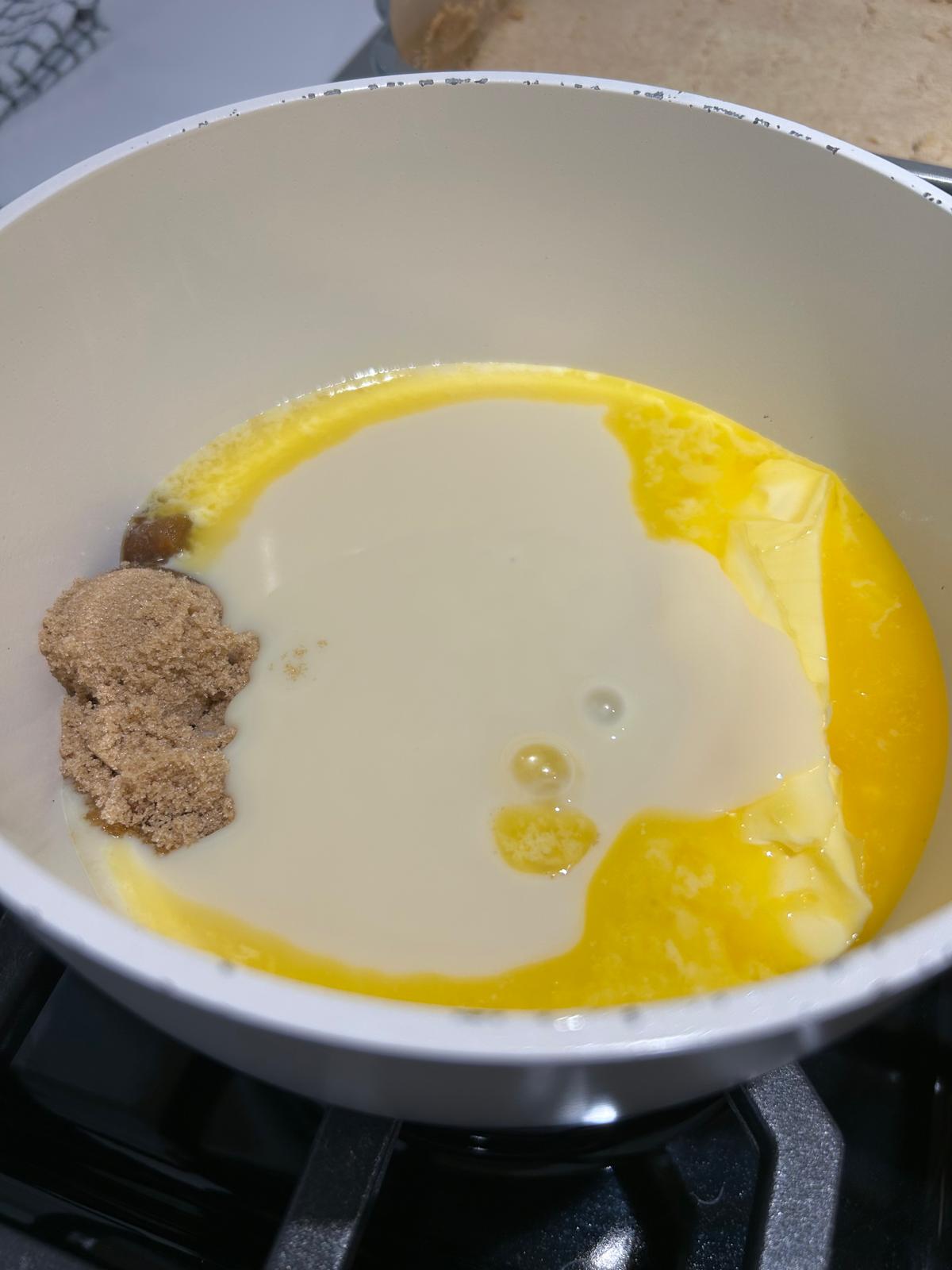 - Place the condensed milk, butter and brown sugar into a saucepan and heat over a medium heat stirring continually. Allow to come to a gentle boil then reduce the heat to low and continue to heat and stir until the caramel turns light golden and starts to pull away from the sides of the pan. This should take around 10 to 12 minutes.