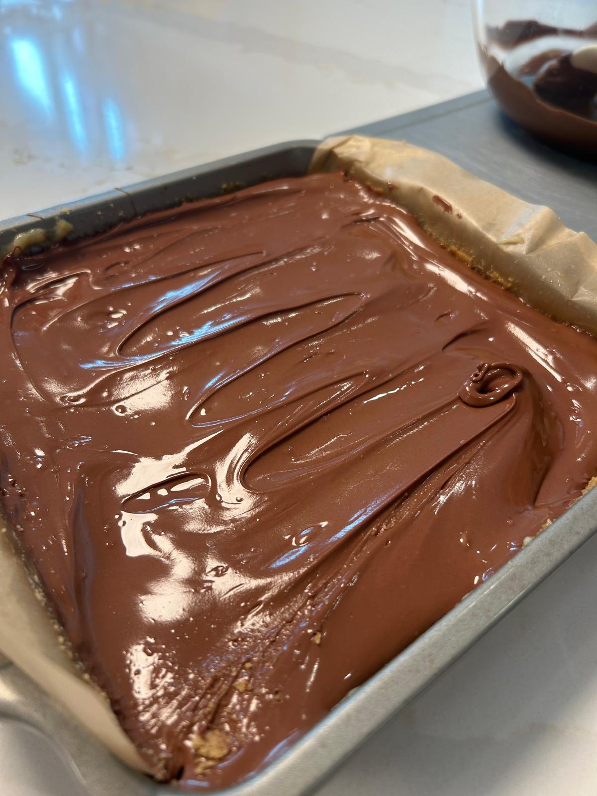 - Melt the chocolate and pour over the top of the chilled caramel then place back in the fridge to harden the chocolate for around 15 to 30 minutes