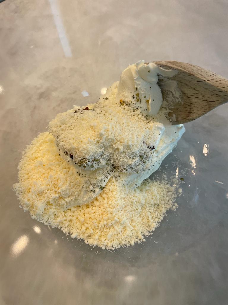 - Place the cream cheese, sour cream, oregano, chilli flakes and half a teaspoon of salt into a bowl and stir to combine.