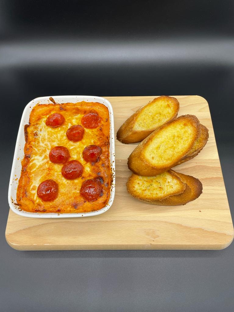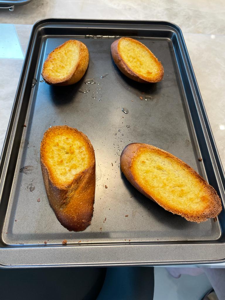 - Slice the baguette, brush with olive oil and lay onto a baking sheet. Place into the oven for the last 6-8 minutes of baking.