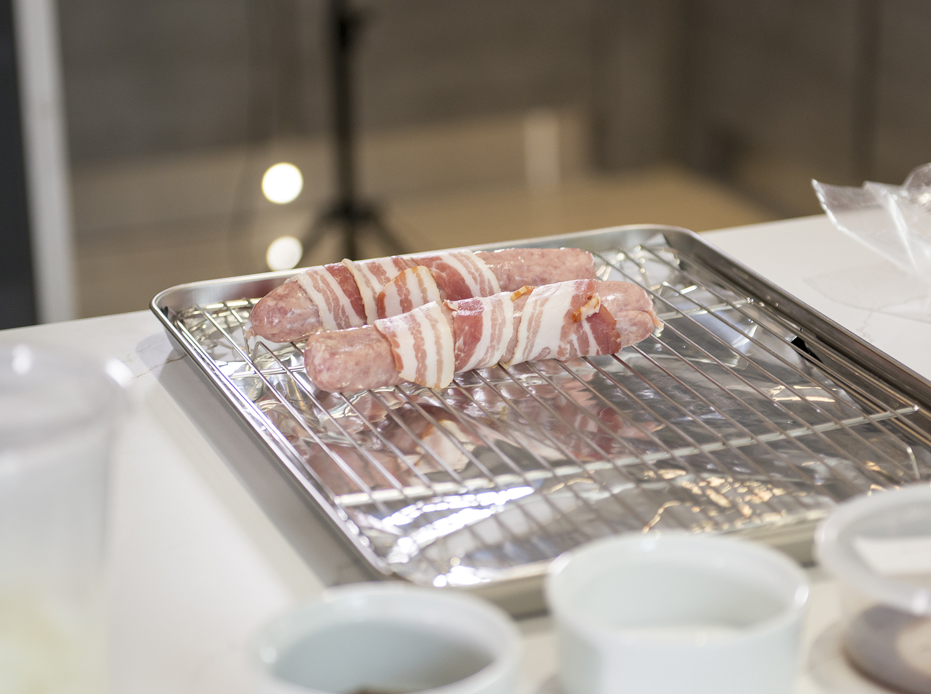 - Heat the oven to 200ºc. Wrap a bacon rasher around each sausage and place onto a rack over a baking tray.