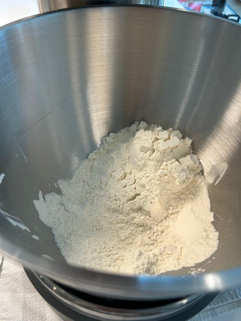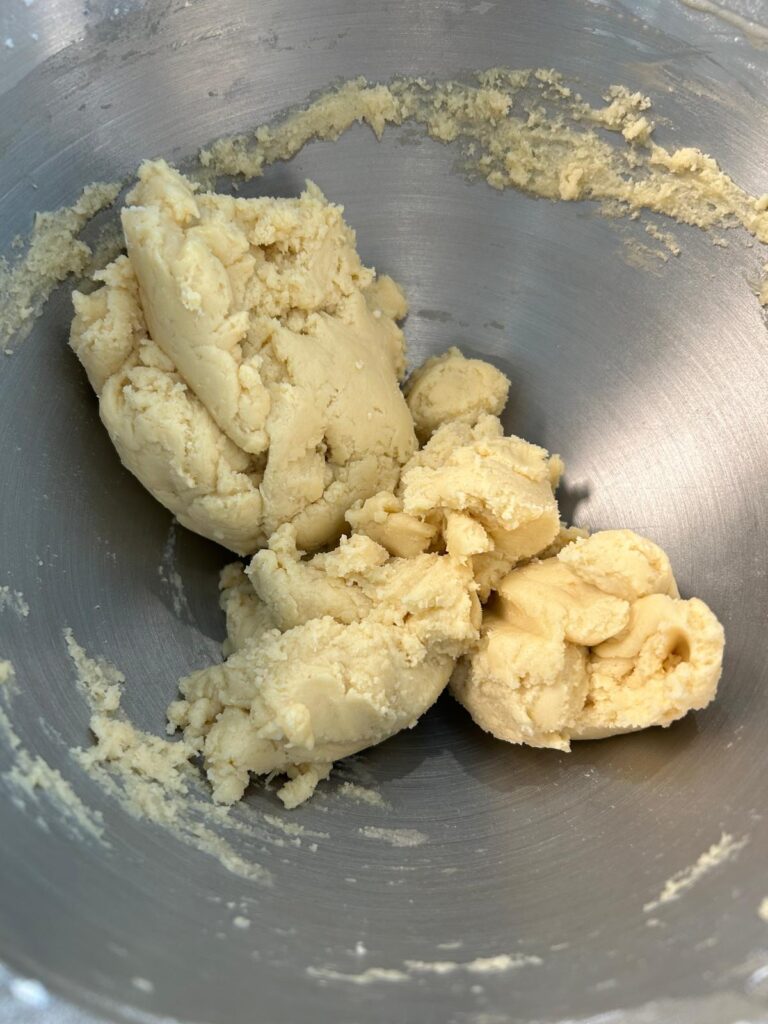 - In a separate bowl, combine the flour, confectioners sugar and baking powder. Mix in the shortening followed by the extracts until the mixture is wet and resembling crumbs