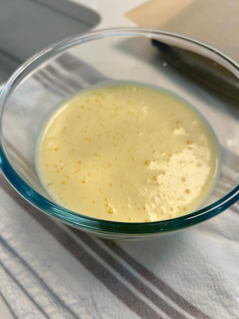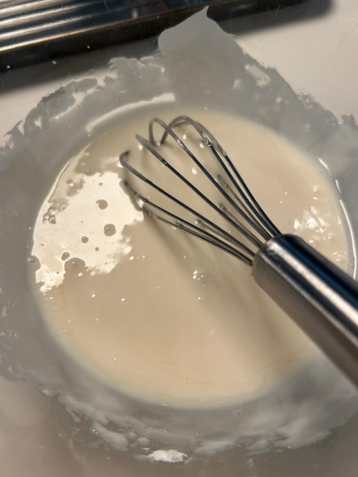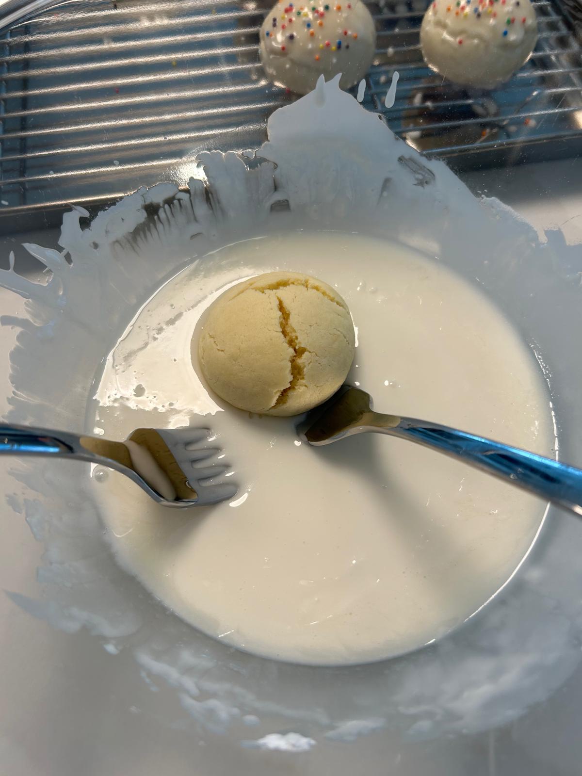 - Whilst the cookies are baking, make the glaze. Combine the confectioners sugar, milk and extracts until you have a smooth glaze.