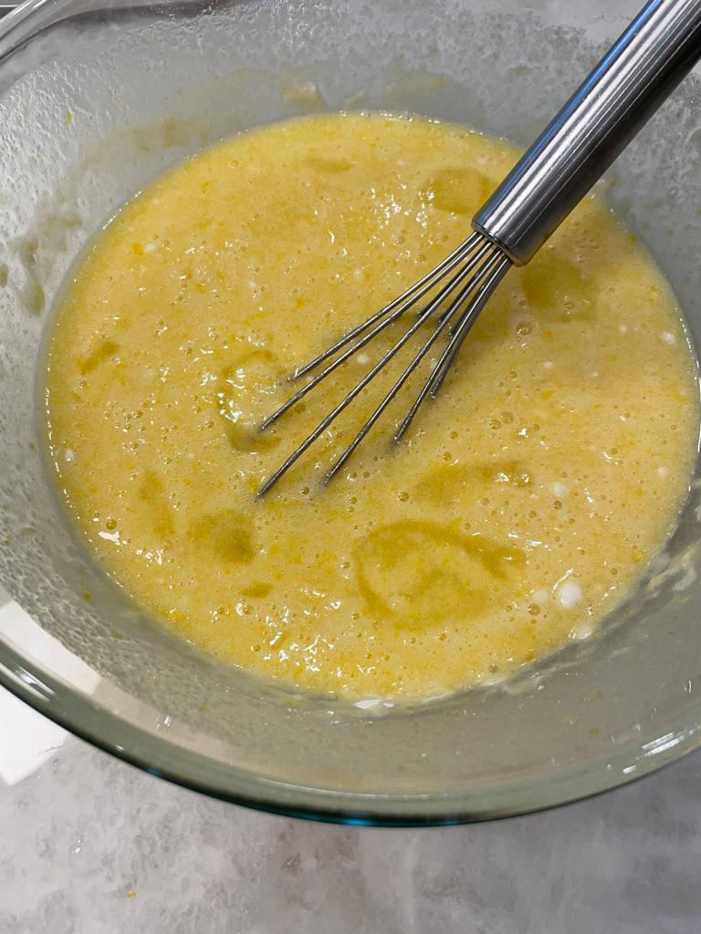 - Now to make the filling. In a large bowl whisk together the eggs, sugar, lemon juice, lemon zest and flour.