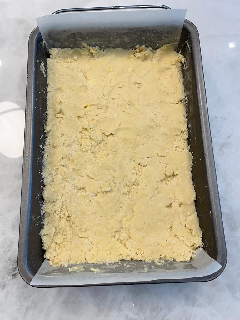 - Pour the mixture into the prepared pan and press down. A measuring cup works well for pressing it flat and even.