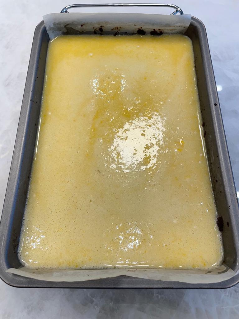 - Pour the lemon mixture the top of the cooked base and immediately place the pan back into the oven and bake for a further 30-35 minutes until the topping is firm and set.