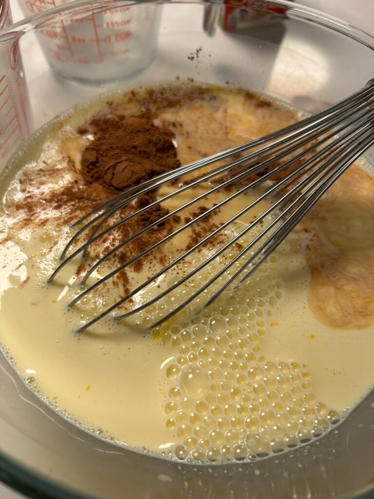 - Crack the eggs into a very large jog or mixing bowl and whisk to break up the yolks. Whisk in the half and half and milk then add in the cinnamon, brown sugar, vanilla and salt.