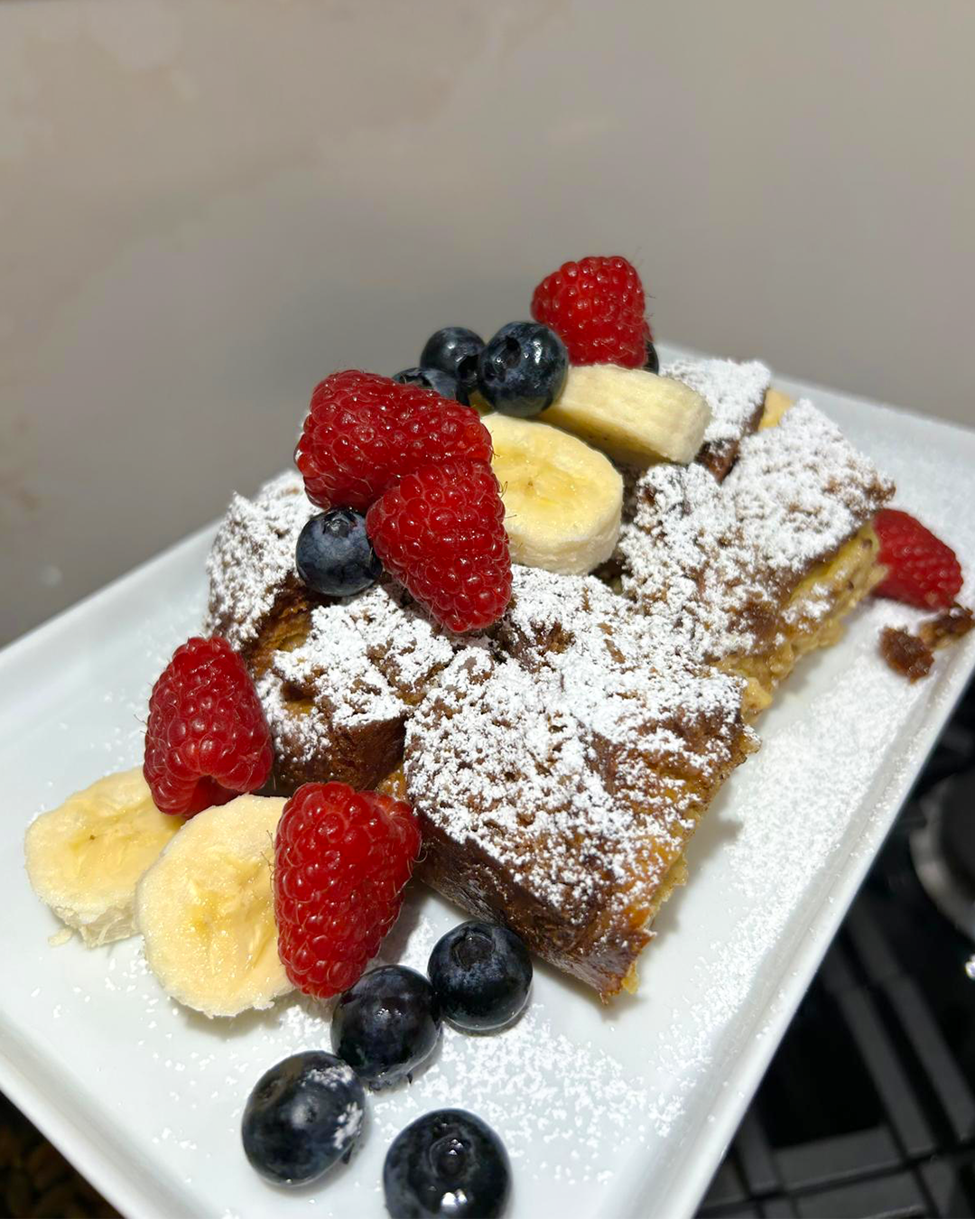 - I served this with powdered sugar, bananas, blueberries and raspberries and a generous drizzle of maple syrup.