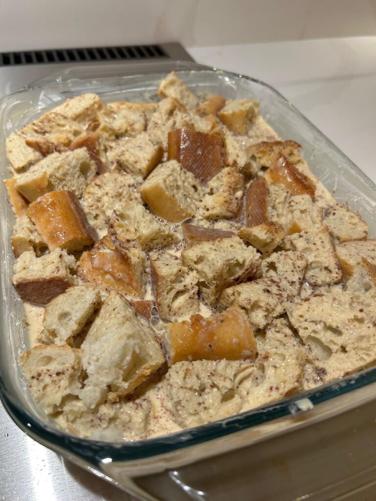 - Grease a large baking dish with softened butter and place the bread pieces into it. Pour the egg mixture over the bread and toss to ensure that all pieces are coated.