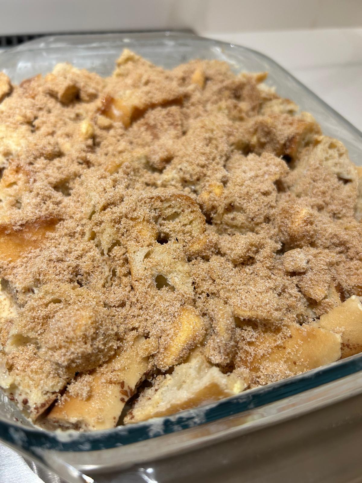 Cinnamon-spiced French toast bake with a crunchy brown sugar topping. Just prep the night before and bake in the morning! Perfect for brunch or a cozy weekend breakfast. 🍓