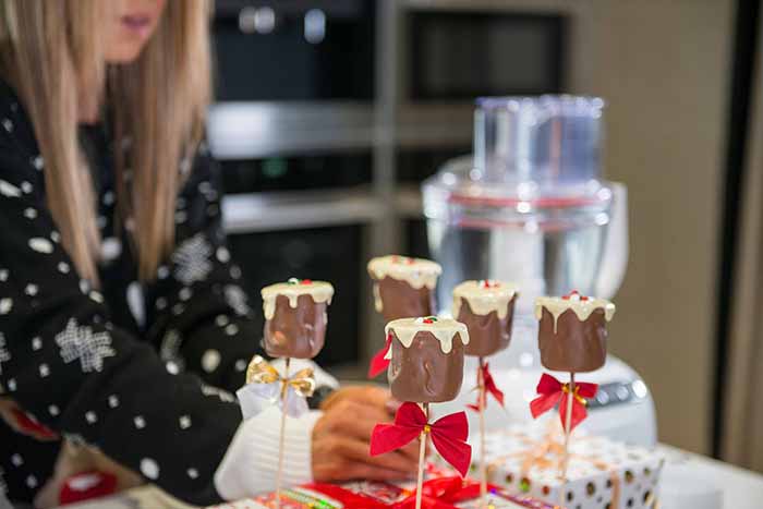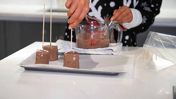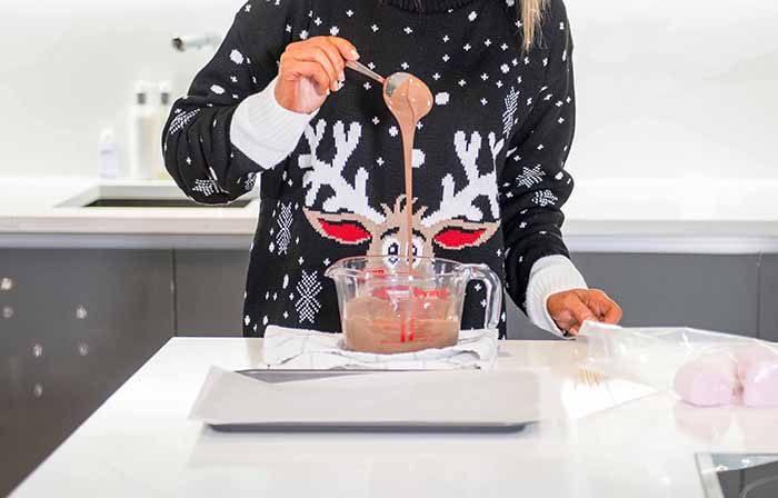 - Melt the milk chocolate in a bowl and dip each marshmallow in to coat. Place on the baking tray to set.
