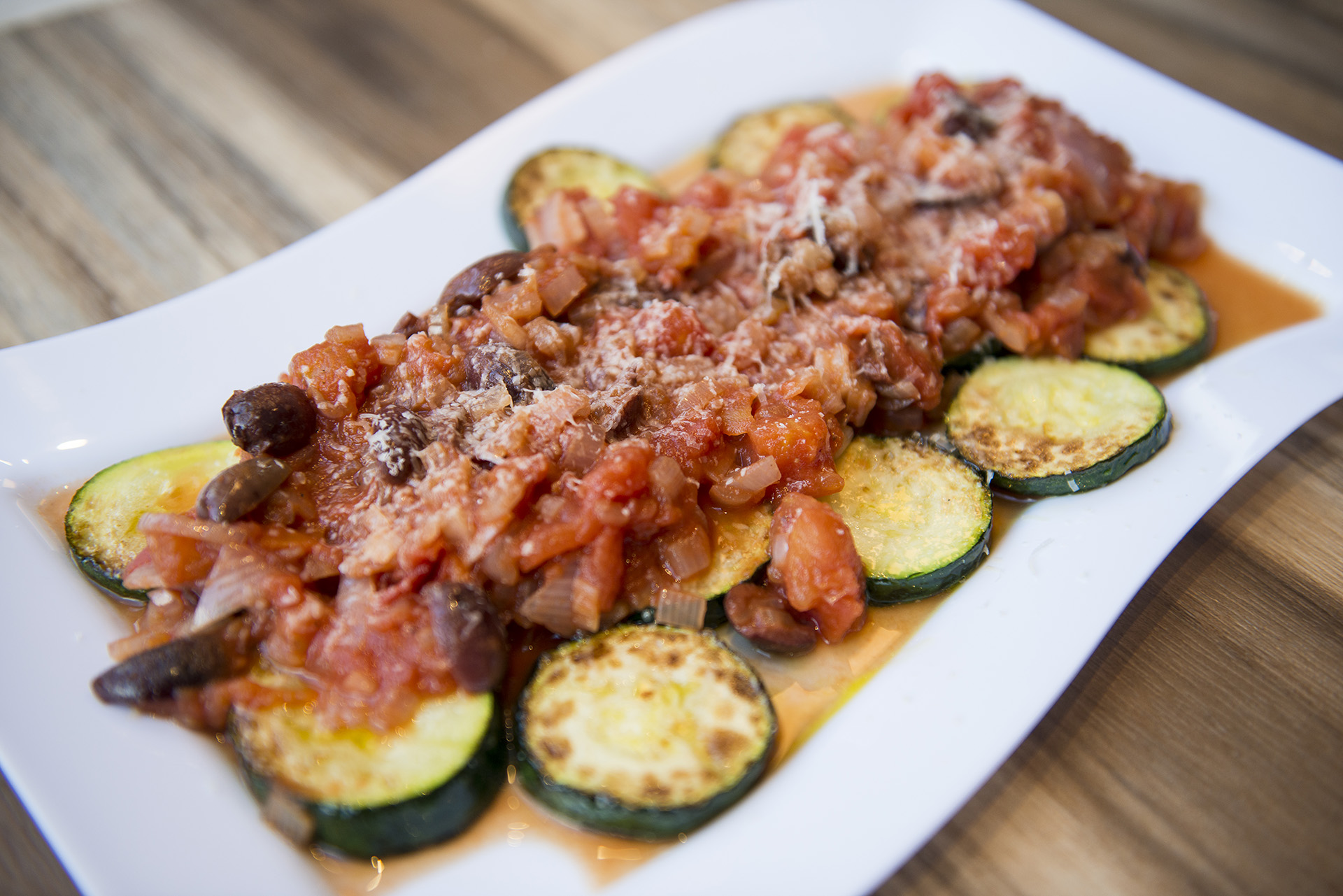 - Pour the tomato mixture over the sliced courgettes. Finish with a little more grated parmesan and serve.