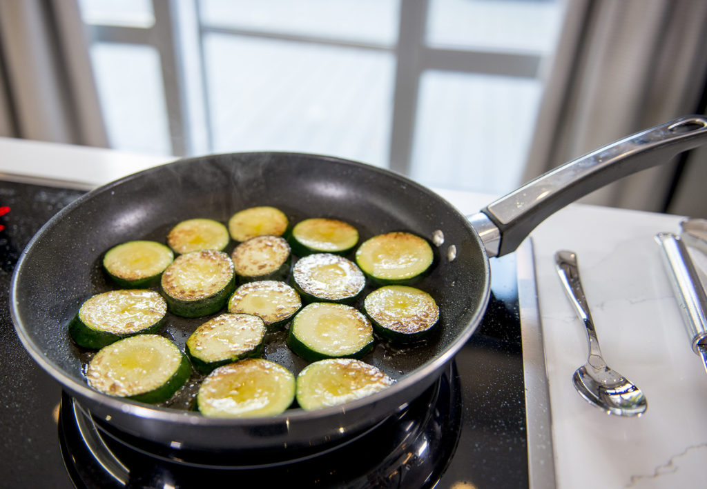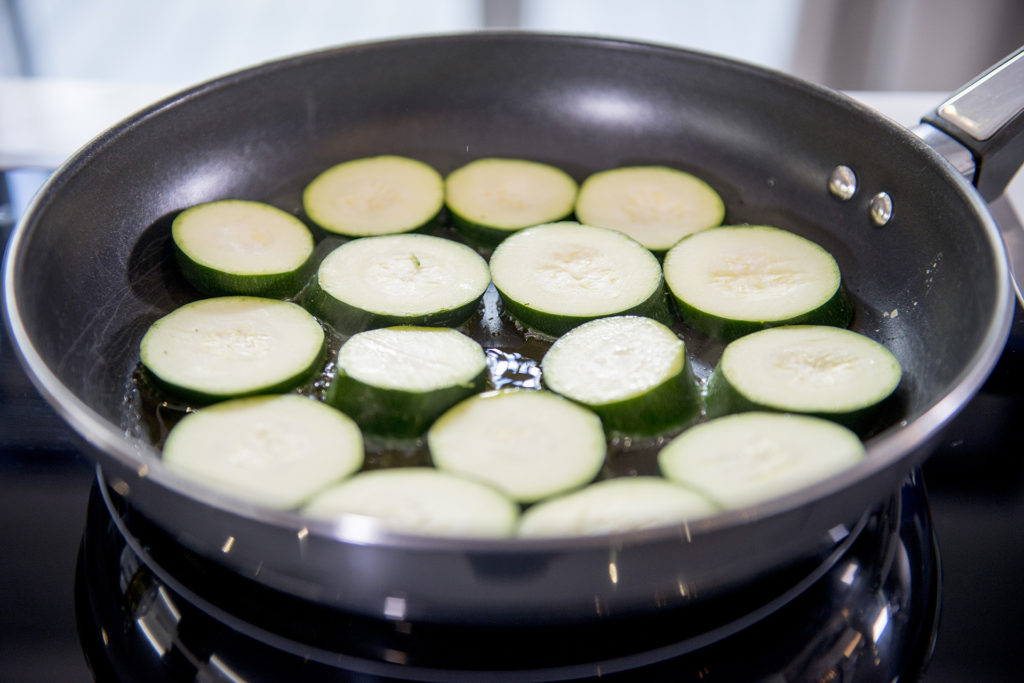 - Heat 2-3 tablespoons of olive oil in a large pan and add in the sliced courgettes.