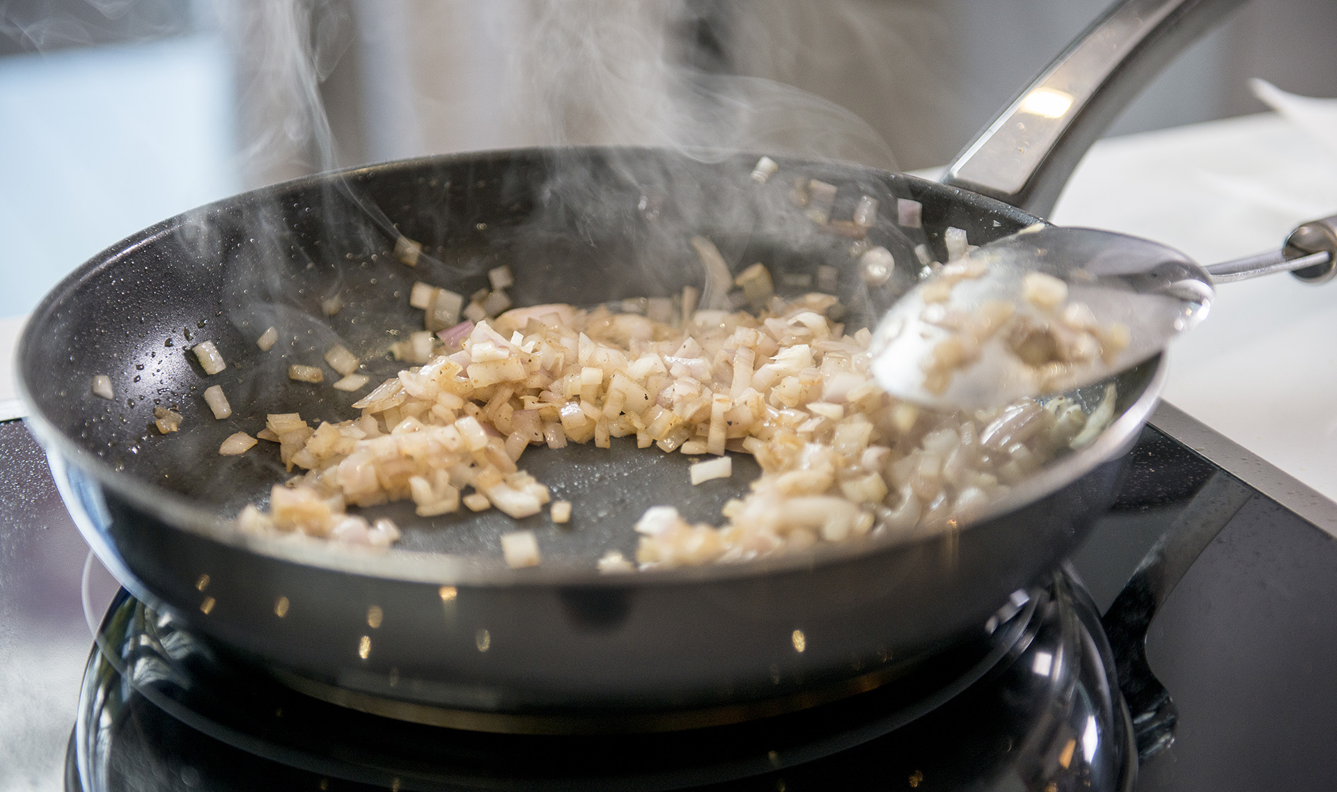 - Add the chopped shallots to the same pan adding more olive oil if required then add in the anchovy paste.