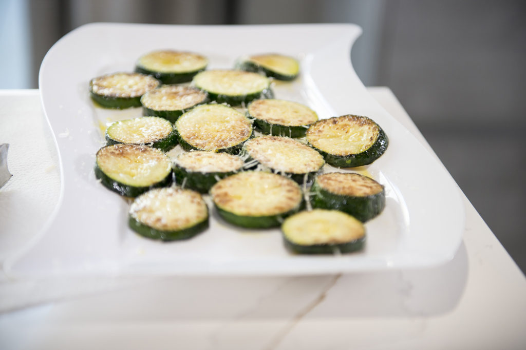 - Whilst these are starting to cook down grate parmesan over the courgettes whilst still hot.