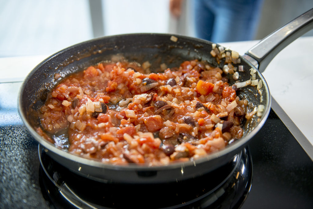 - Once the shallots have softened add in the sliced olives before pouring in the tin of chopped tomatoes.