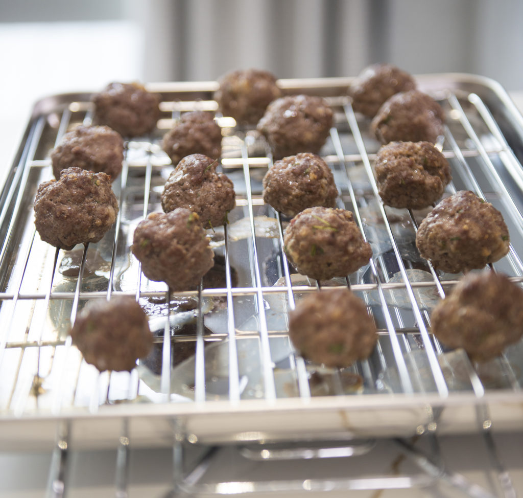 - Place the meatballs on a rack over a large baking tray and bake at 200oc for around 10-15 minutes until browned and cooked through.