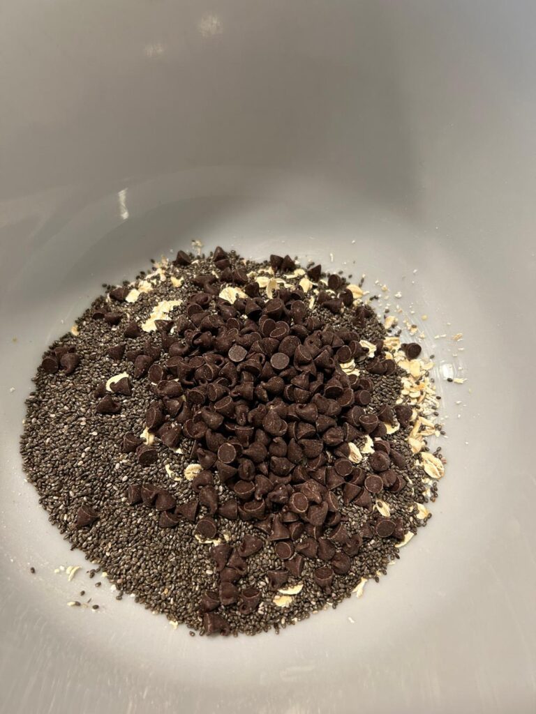 - Stir in the oats and chia seeds as well as the cacao nibs.
