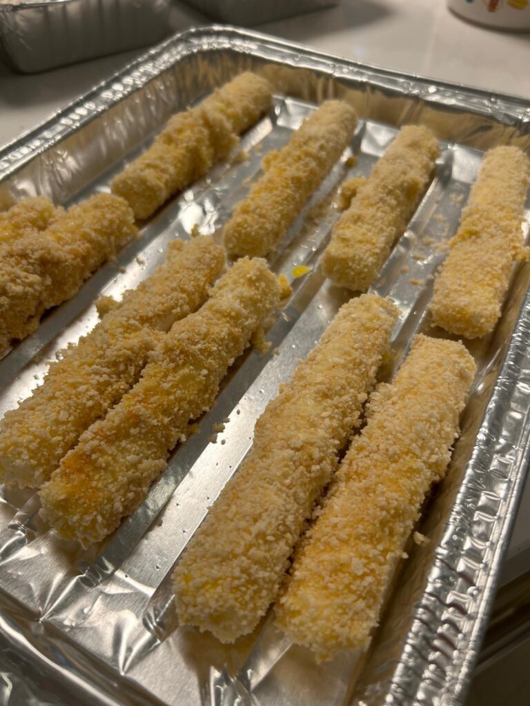 • Place the tray in the freezer for one hour to firm the mozzarella sticks.
