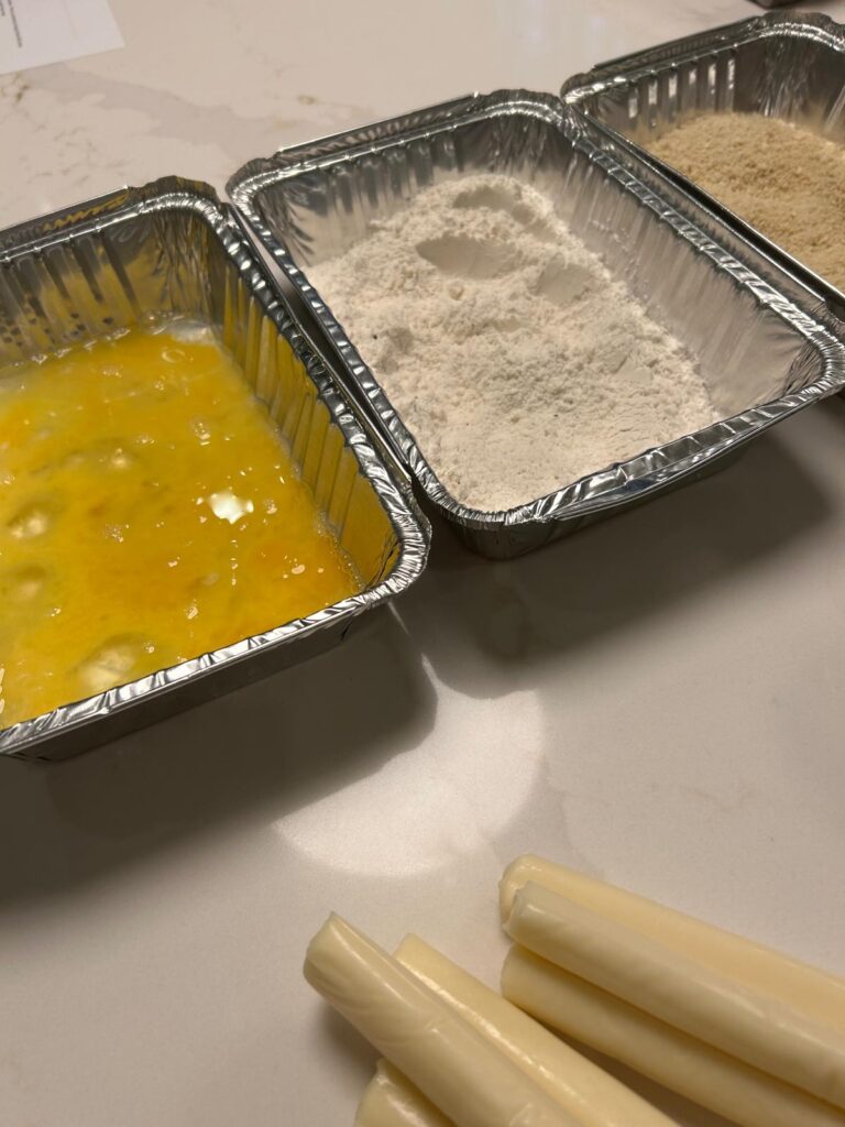 • Take each mozzarella stick and dip it into the egg, then the flour mixture, back into the egg and finally into the breadcrumbs.