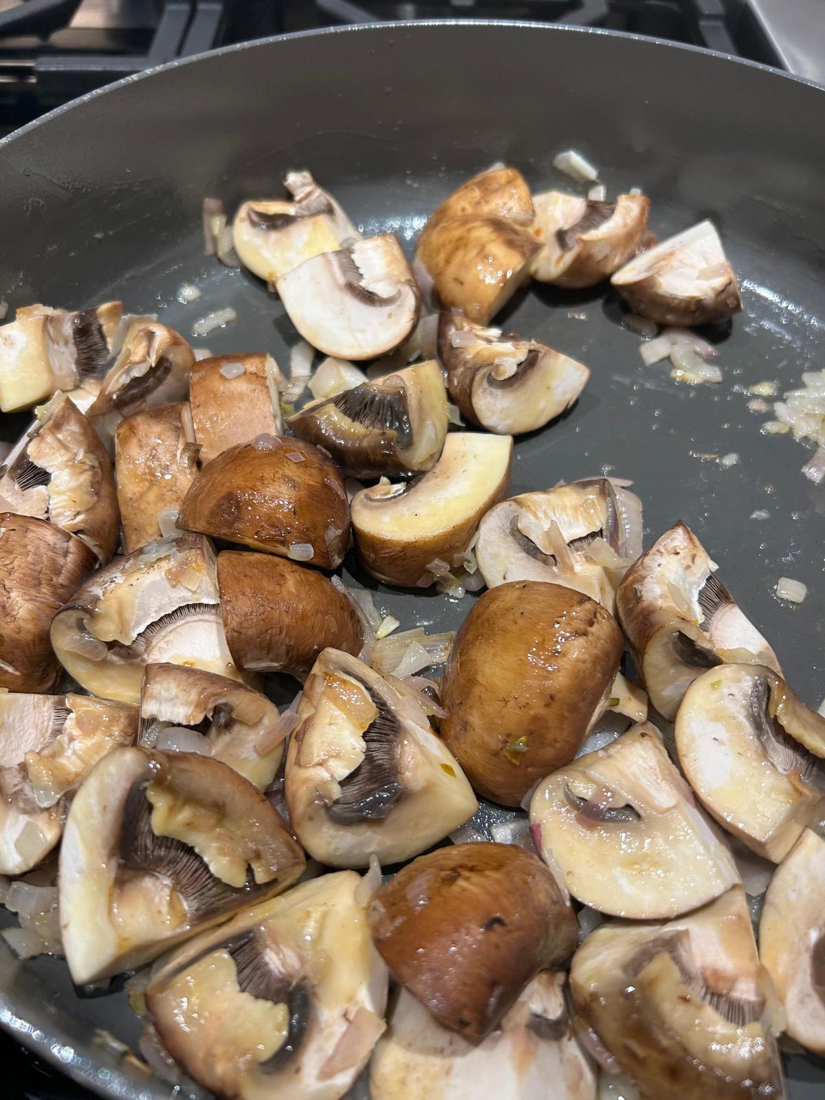 - Add the shallots and cook for 2–3 minutes until translucent, then add in the mushrooms and season with salt and pepper.