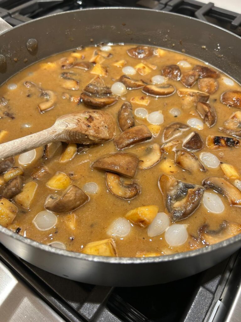 - Add in the broth and deglaze the pan, then add in the Worcestershire sauce and pearl onions.