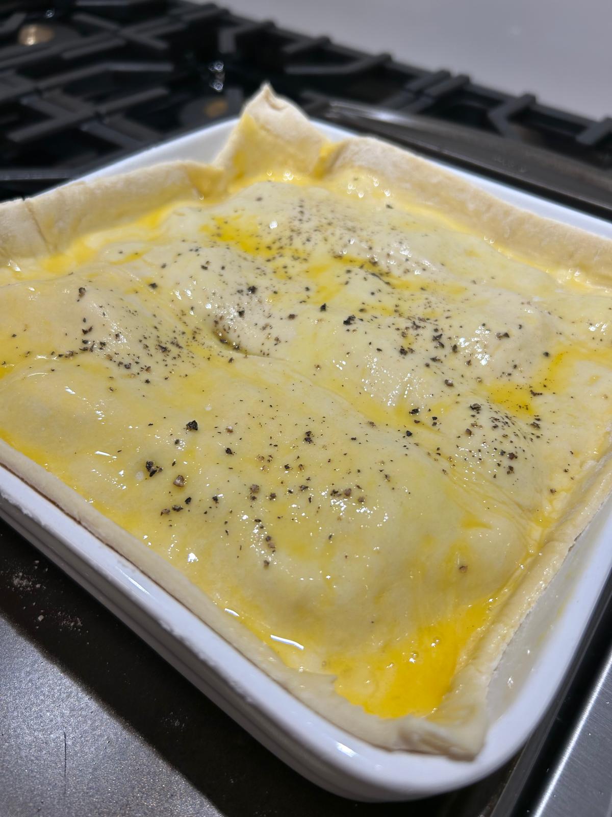 - Brush the top of the pastry with the beaten egg and sprinkle over the remaining chopped thyme and some cracked black pepper.
