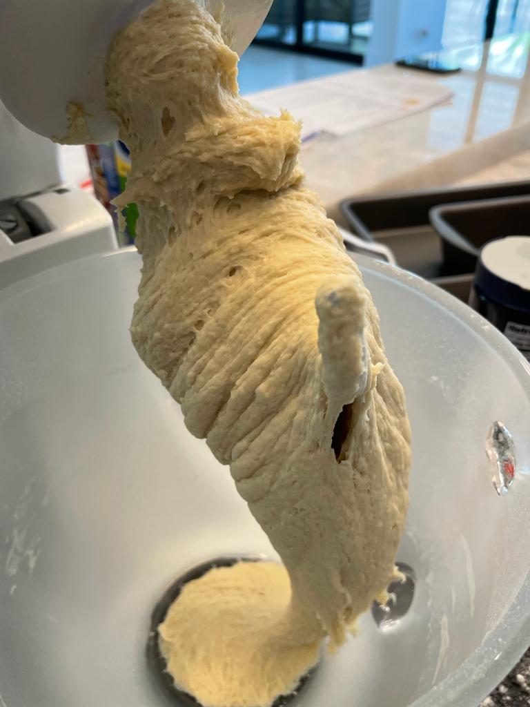 - Now add in the flour, egg, yoghurt, salt and baking powder and using the dough attachment mix on a low speed for a couple of minutes until sticky but smooth.