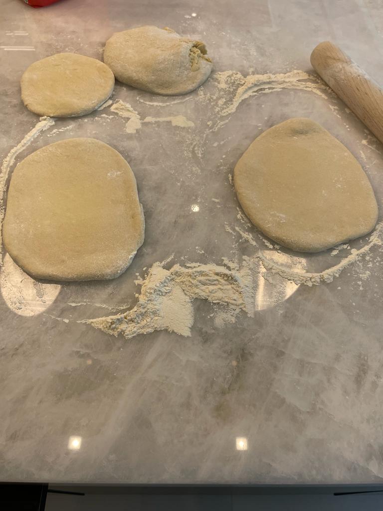 - Add one of the rolled out doughs and cook until bubbling up and golden then flip to cook the other side for around 45 seconds to one minute.