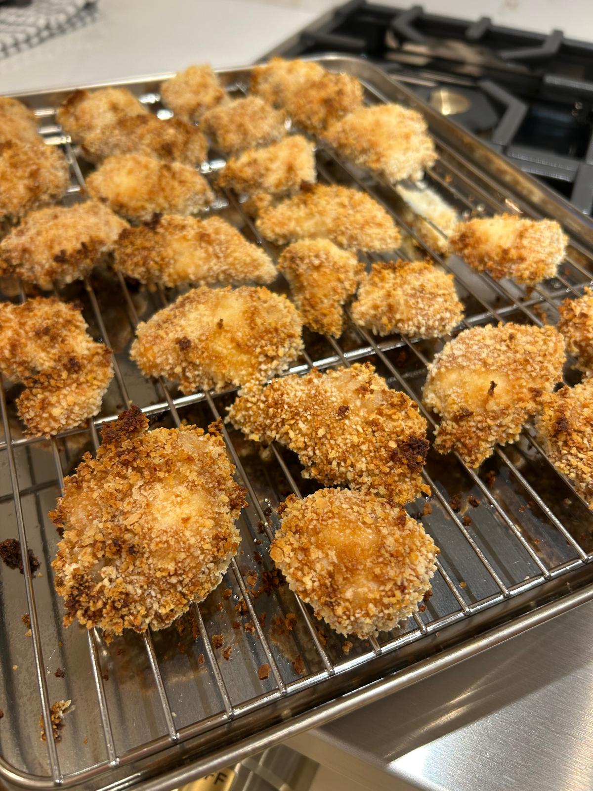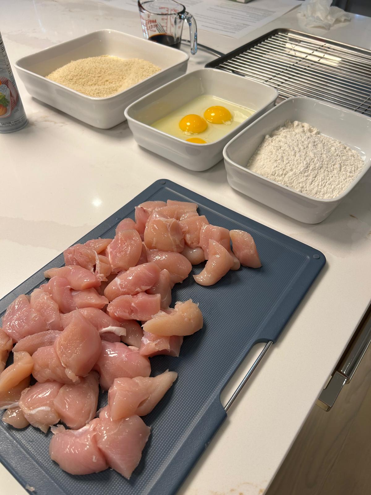 • Add the cubed chicken into the flour and shake of the excess, then dip into the egg and finally coat in the panko breadcrumbs. Place evenly spaced onto the rack over the baking sheet.