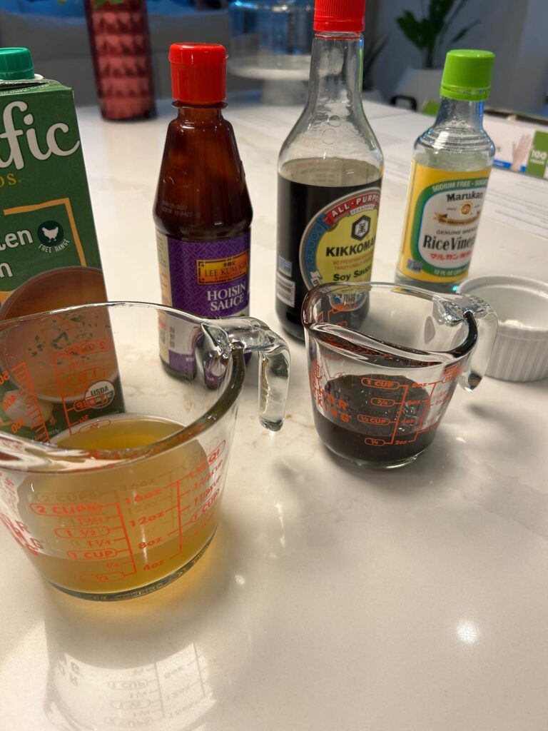 • In the meantime, make the sauce. Mix together the cornstarch, rice vinegar, hoisin sauce, soy sauce and chicken broth then set aside.