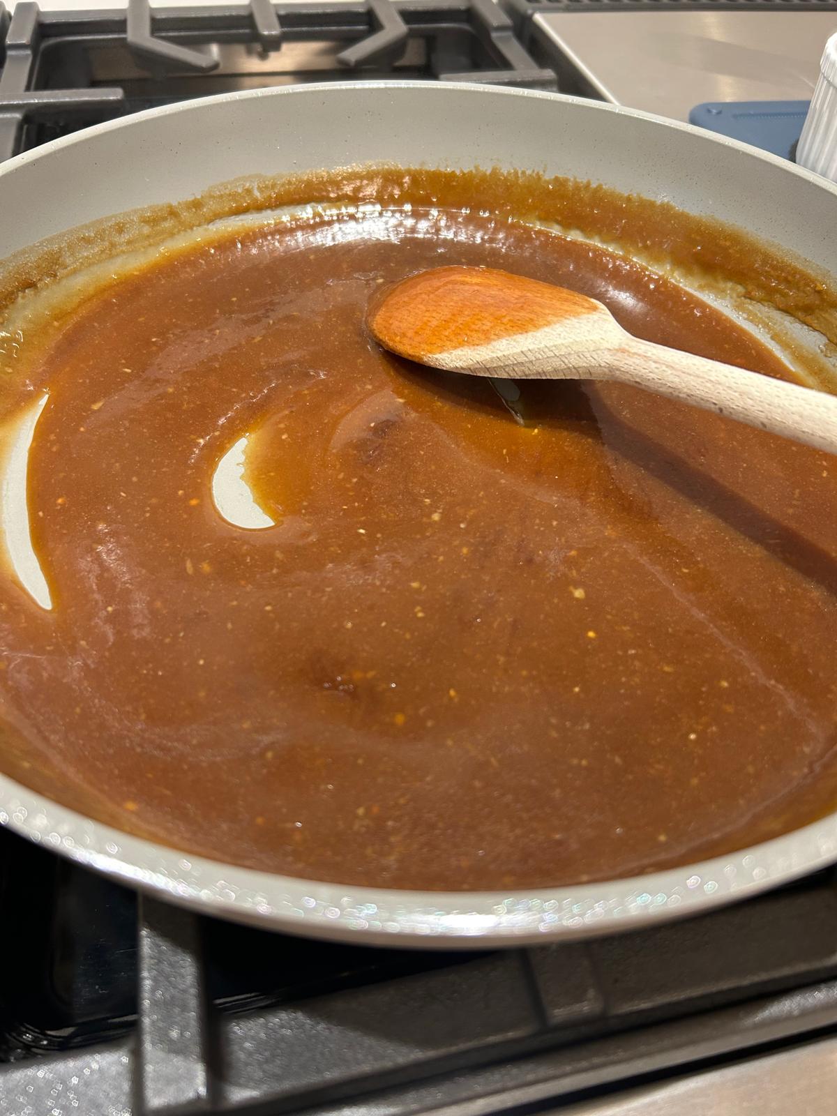 • Add in the hoisin and soy mixture and heat until simmering whilst stirring until smooth and thickened and glossy.