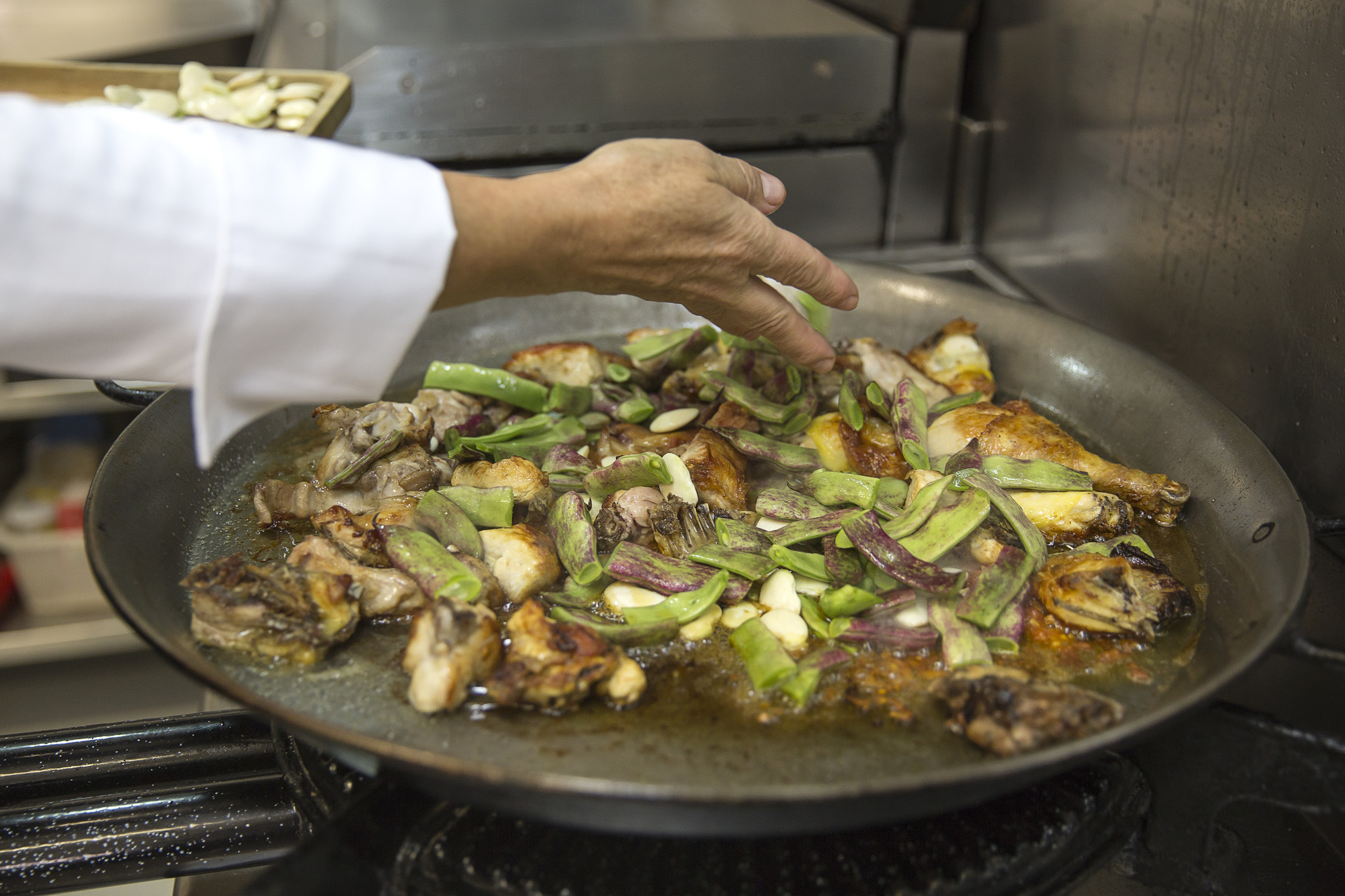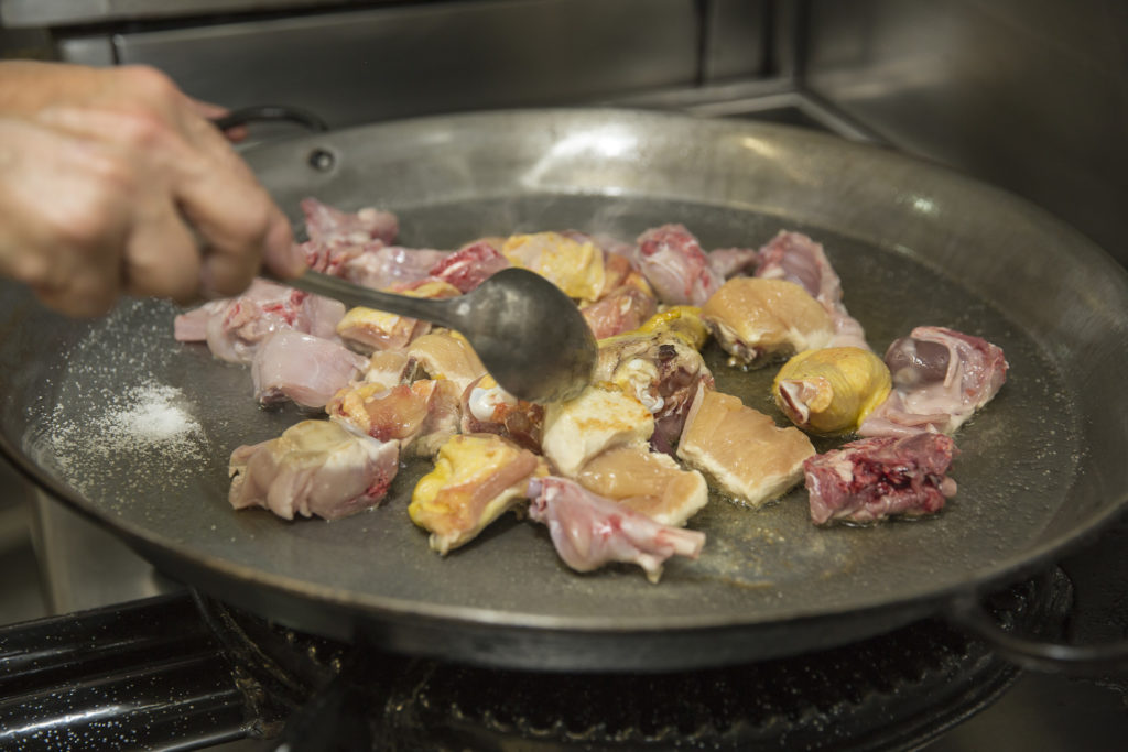 - Heat a large paella pan with the base covered with olive oil and add the chicken and rabbit pieces. Season with salt.