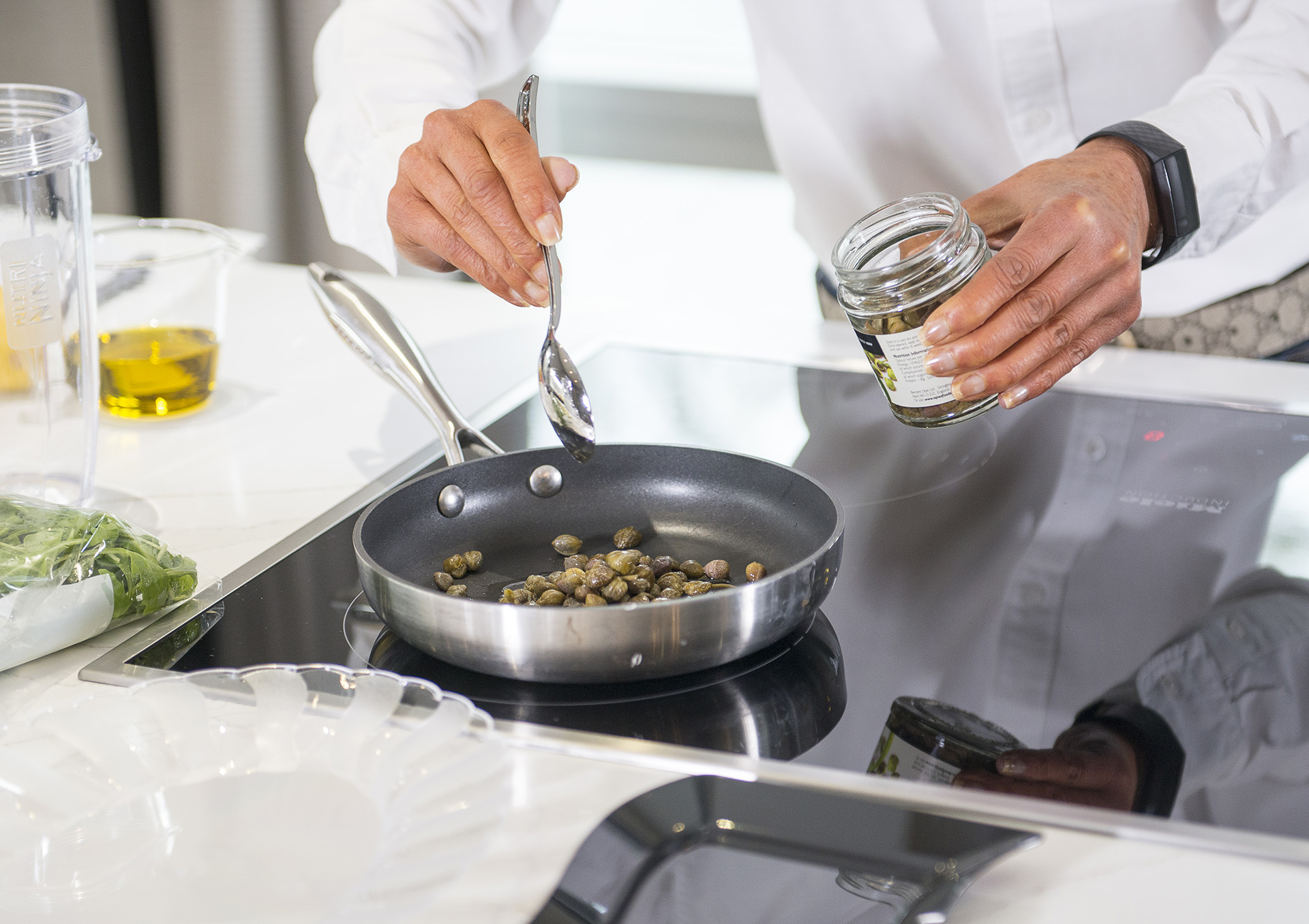 - In a separate pan, heat a tablespoon olive oil and add in two tablespoons of capers and cook over a medium-high heat until crispy.
