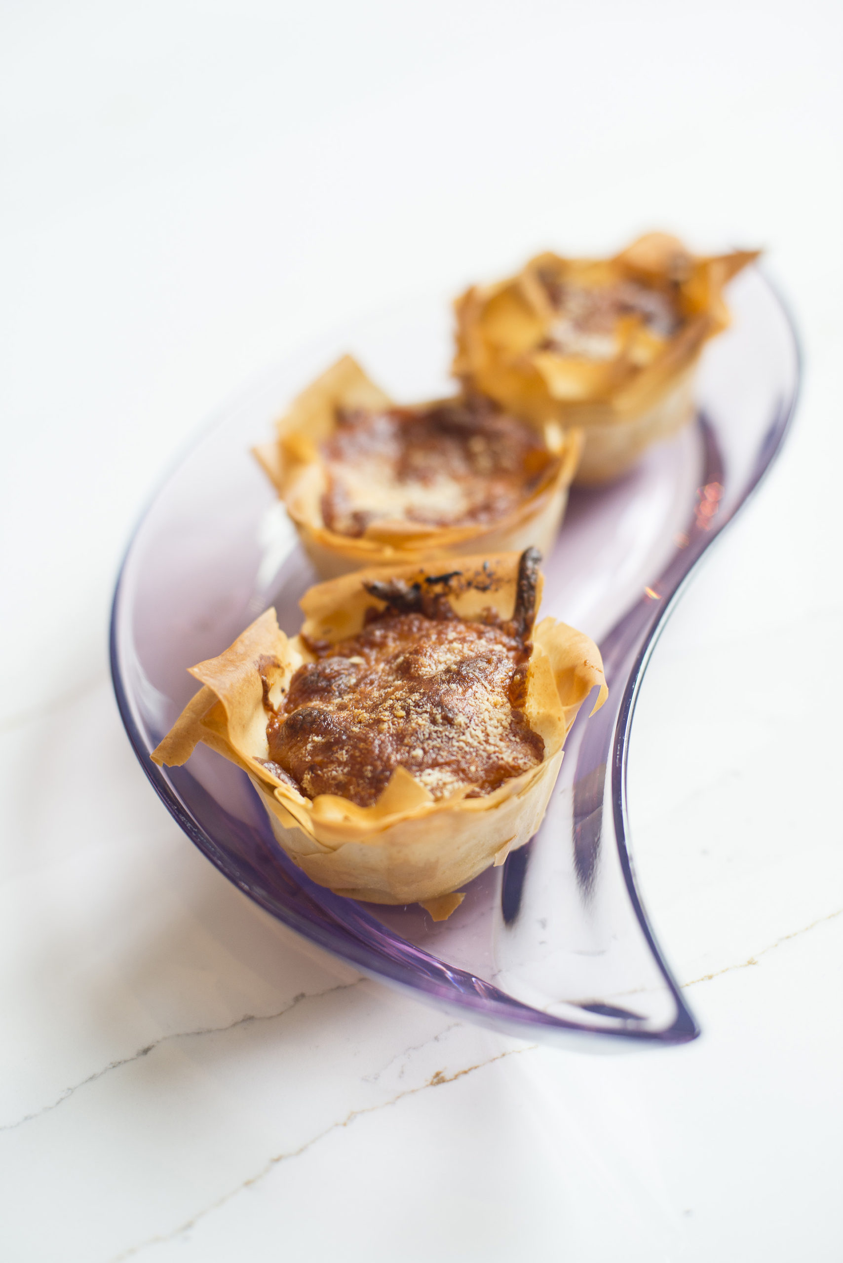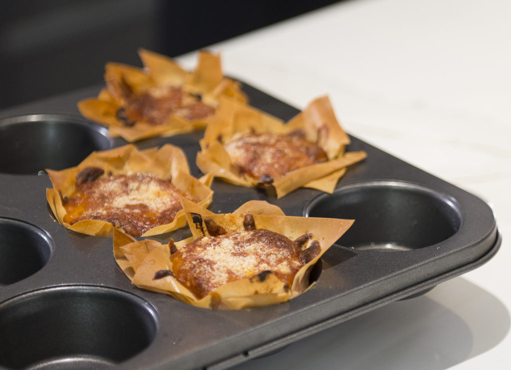 - Place some of the aubergine mixture into the bottom of each filo cup then top with some of the grated mozzarella cheese.