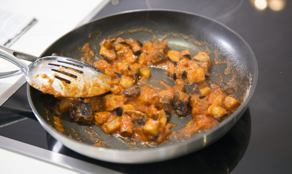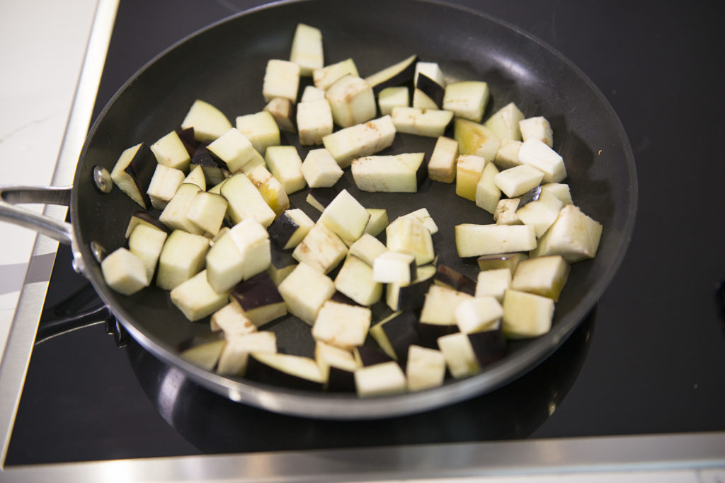 - Heat a wide bottom pan and add some olive oil. Add the aubergine and cook until soft and golden – around 8-10 minutes