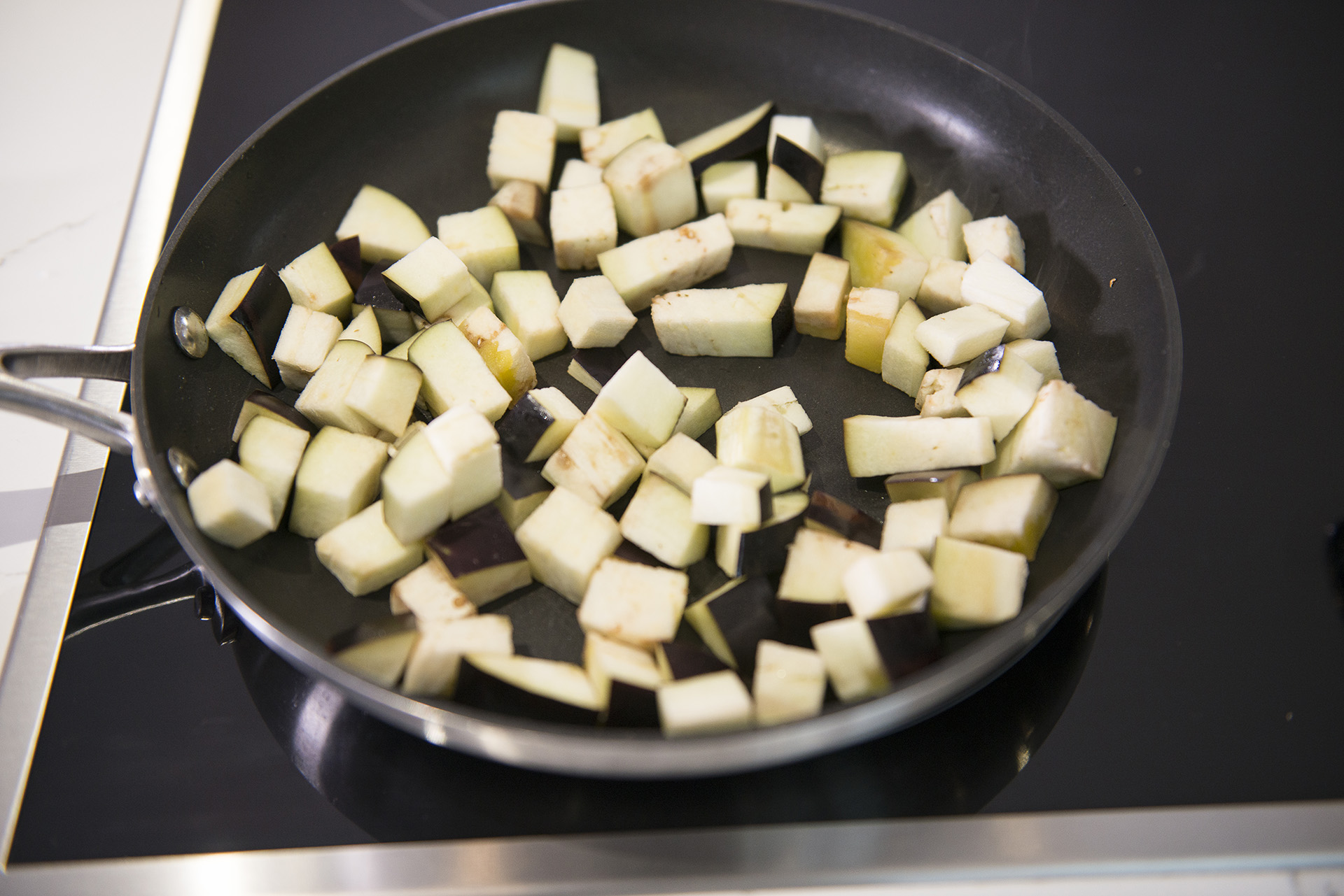 - Chop the aubergine into half inch pieces