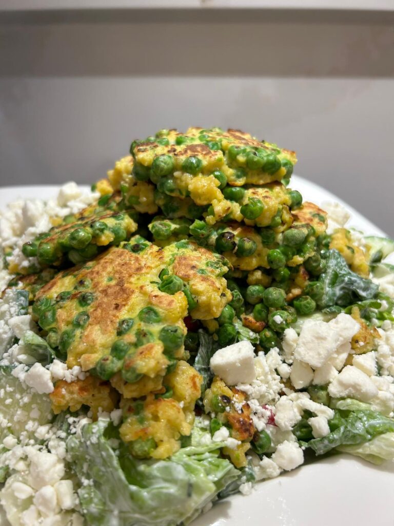 Fresh, crunchy, and full of flavor, this Pea Fritter Salad combines golden fritters, crisp veggies, and a lemony dill yoghurt dressing for the ultimate vegetarian meal.