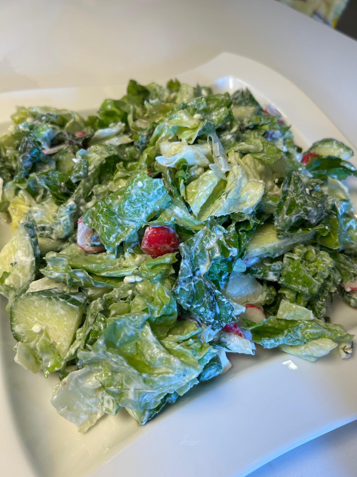 • Toss the salad leaves, radishes, and cucumber with half the yoghurt-dill sauce.