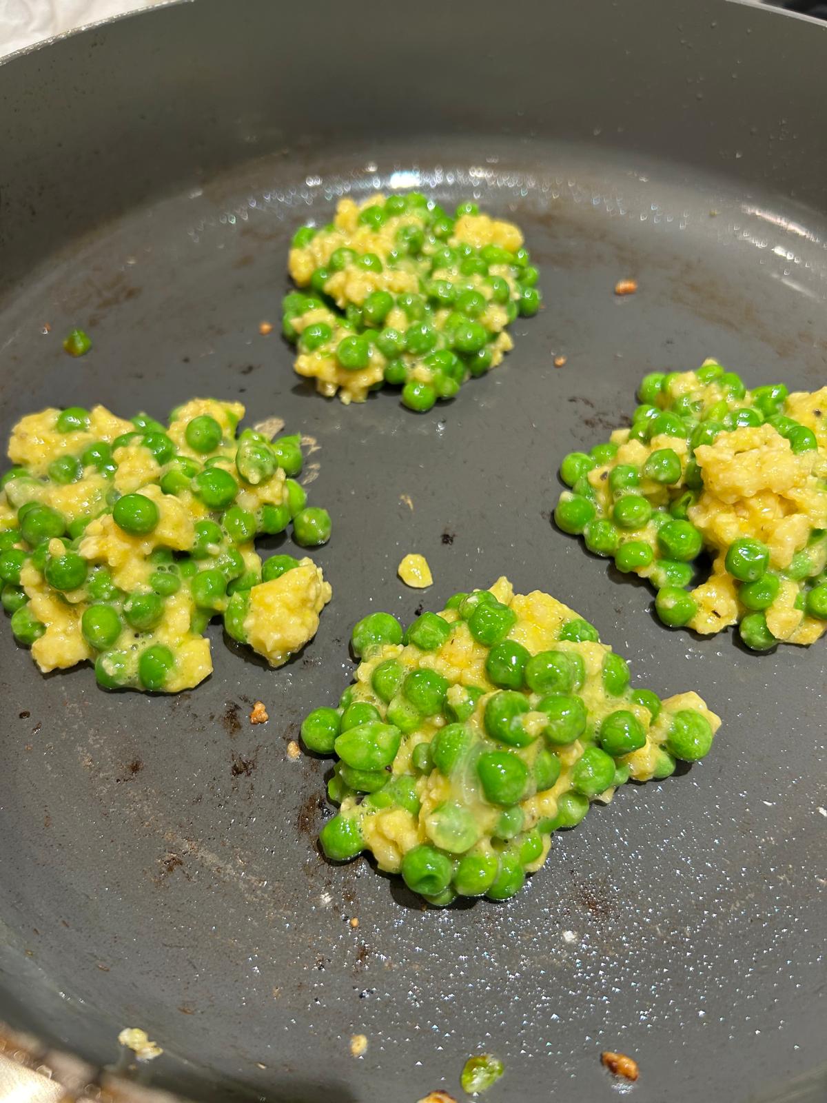 • Roughly mash the peas in a separate bowl and add the garlic, eggs, flour, lemon zest, breadcrumbs, and a little salt and pepper. Stir to combine.