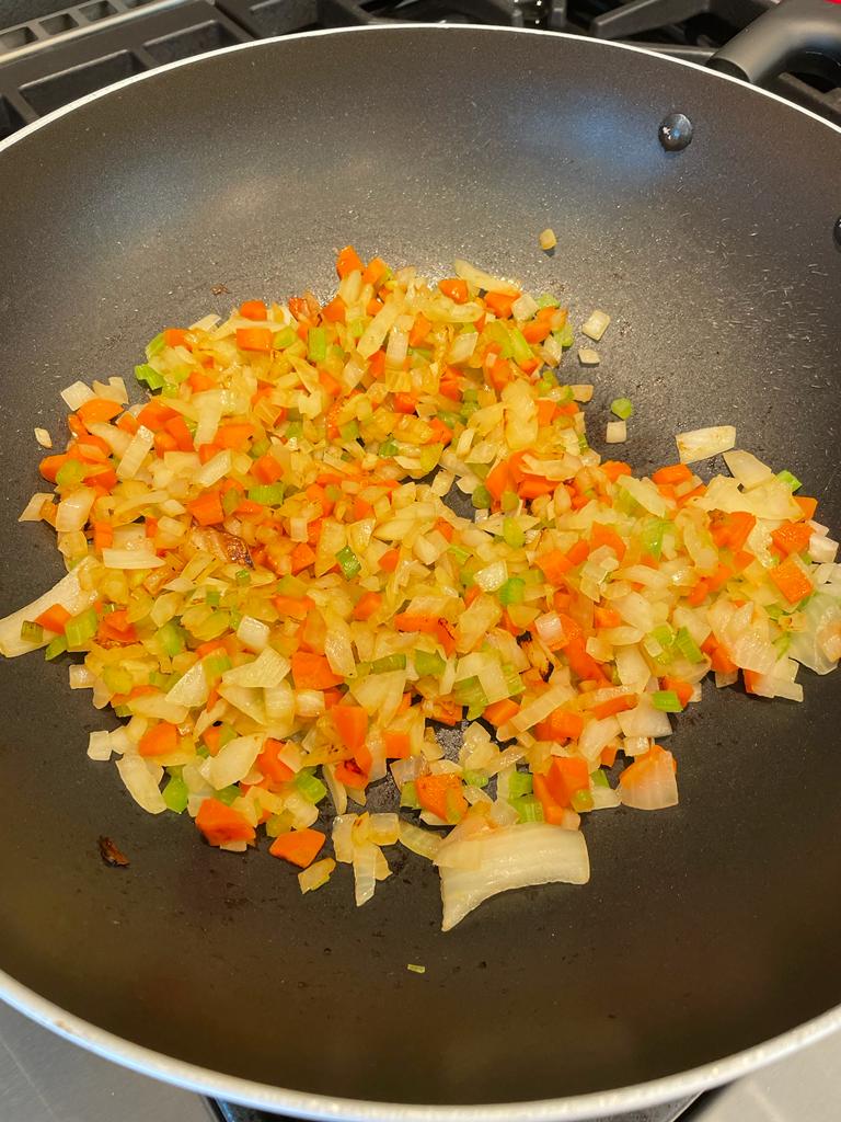 - Heat the oil then add the carrots, celery and onion and saute until softened which will take around 6-7 minutes